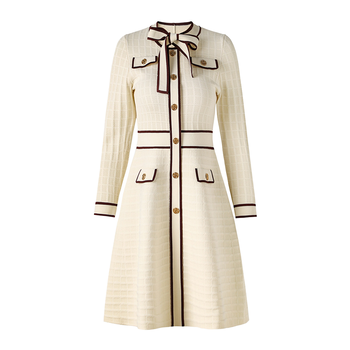 เดรสยาวมิดิถักแขนยาวผ้าทวีดเดรสยาวแต่งกระดุมแขนยาวทรงเอไลน์และแขนเสื้อตัดกัน